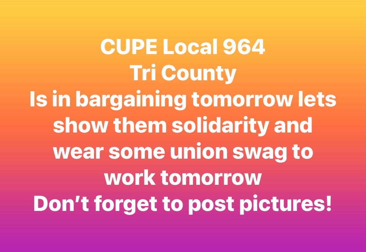 Local 964, Tri County is starting bargaining tomorrow, Monday, March 2nd, 2026. We are asking all locals to wear some union swag or black clothing as a show of solidarity.